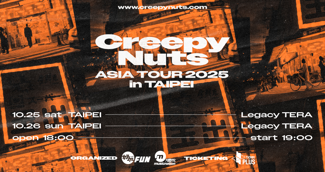 過去 Creepy Nuts 曾三度來台參與音樂祭,2023 年「RUSH BALL in 台湾」、2024年「春浪」、及今年2025年的「大港開唱」,每次演出都吸引大批樂迷朝聖。隨著今年 2 月發行的專輯《LEGION》並成功舉辦東京巨蛋演唱會,他們今年 10 月正式啟動首次亞洲巡迴,足跡將遍及首爾、台北、香港、上海、北京等五大城市。