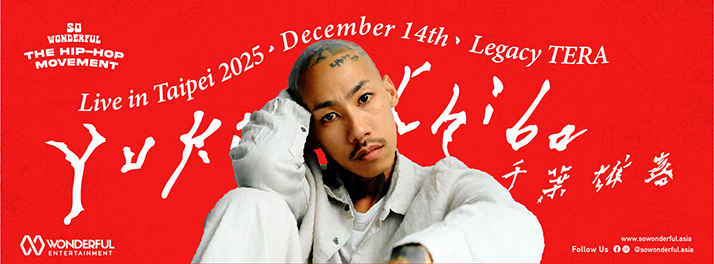 日本嘻哈指標 Yuki Chiba(千葉雄喜) 將於 12 月 14 日首度登上台北 Legacy TERA!從東京街頭走向國際嘻哈圈,千葉雄喜以真摯的創作能量與跨界的音樂風格,掀起日本嘻哈新浪潮。他的音樂融合嘻哈、R&B、電子與日式美學,真實、強烈又極具前衛感,是當前日本嘻哈圈數一數二的話題代表人物,更被譽為「將日本街頭文化帶向世界的關鍵人物之一」
