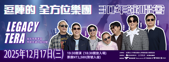 | 開放售票: | 11/17(一)12:00 逗陣的 全方位樂團30年演唱會 全面啓售 |