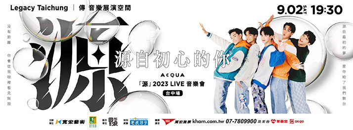 AcQUA源少年,感謝歌迷台北兩場完售支持,特別加演台中場,回到水流的原處,從最純粹青春的律動,演進到暗夜魅力的釋放,集結須弘道、盧佾暘、黃莑茗、李秉諭、林毓家每位成員超齡努力與爆發力,觸動你心底的頻率。不只用超能量的表演帶給你力量,也讓我們面對面,褪下顏色、卸下距離,如水一般,近距離交換心情,一起感受最真摯的當下,留存專屬你我的最初回憶。