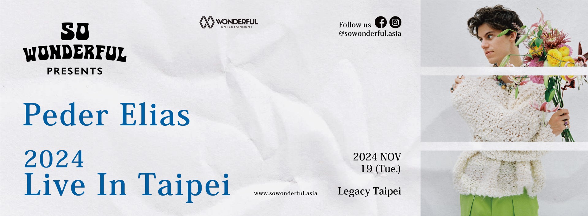 自去年夏天參與 So Wonderful Festival 後,Peder 便與台灣建立了深厚的連結。去年三度來台活動的他,今年也特別再度來台與台灣的「珍珠」們共度美好時光。睽違一年再度來到台北演出,Peder Elias 將以更成熟的姿態與台灣的「珍珠」們再次相聚。除了帶來多首新作與樂迷分享他更成熟的音樂展現之外,總是用心準備每一場演出的Peder 這次將帶給台灣觀眾什麼樣的驚喜,也值得期待!