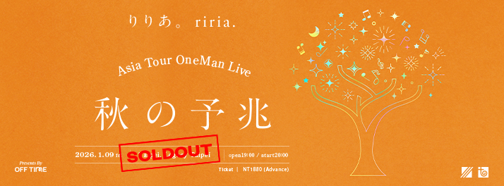 2026 年初,りりあ。將帶著她的亞洲巡演「秋の予兆」來到台北!2026 年 1 月 9 日於 Legacy Taipei 演出,門票將於 2025 年 9 月 14 日中午 12:00 正式開賣。更多資訊請關注 OFF TIME 粉絲專頁。