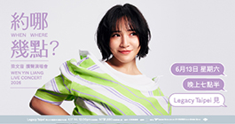 梁文音2026《約哪幾點?》讚聲演唱會 主辦單位: 寬宏藝術經紀股份有限公司 演出場地: Legacy Taipei 音樂展演空間 演出地址: 台北市八德路一段一號華山1914創意文化園區 中五館 演出日期: 2026-06-13(六) -