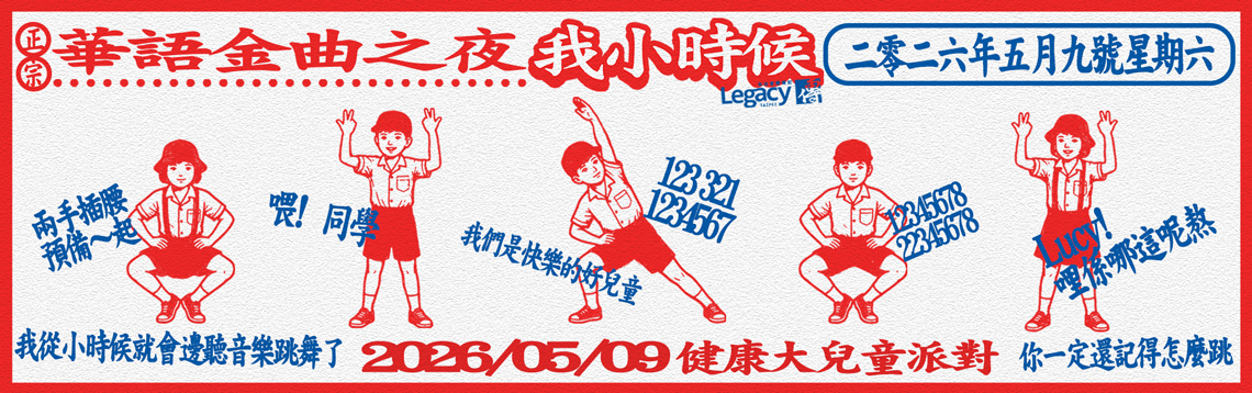華語金曲之夜之我小時候 主辦單位: 野孩子股份有限公司 演出場地: Legacy Taipei 傳音樂展演空間 演出地址: 台北市八德路一段一號華山1914創意文化園區 中五館 演出日期: 2026-05-09(六) -