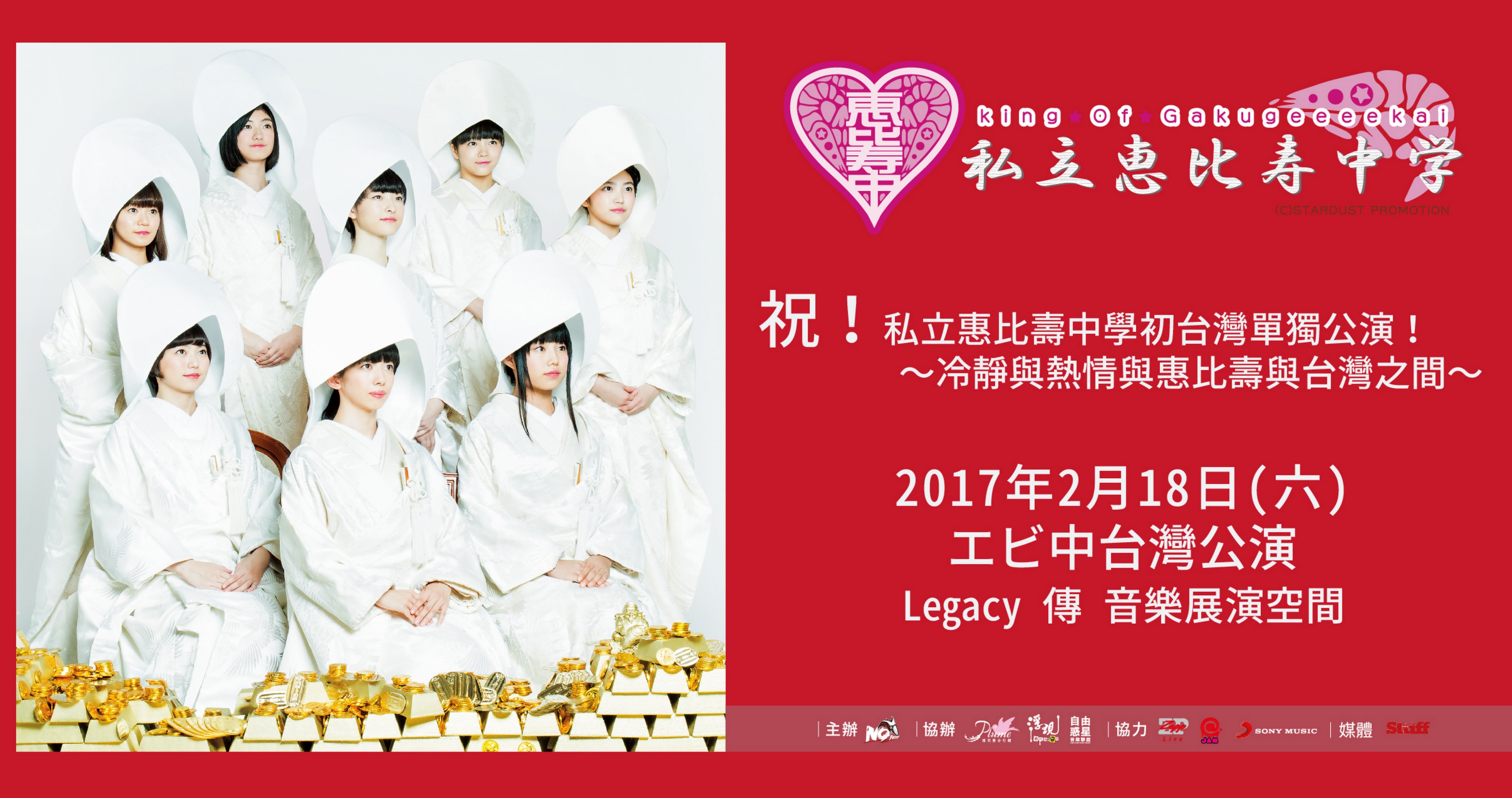 【取消公告】祝!私立惠比壽中學初台灣單獨公演!~冷靜與熱情與惠比壽與台灣之間~ 主辦單位: 無懼 NO FEAR 演出場地: 永豐Legacy Taipei 音樂展演空間 演出地址: 台北市八德路一段一號華山中五A館 演出日期: 2017-02-18(六) -