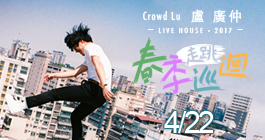 盧廣仲 2017 春季巡迴-台中Rock搖滾 主辦單位: 添翼文創事業有限公司/若霖股份有限公司 演出場地: Legacy Taichung 音樂展演空間 演出地址: 台中市西屯區安和路117號 演出日期: 2017-04-22(六) -