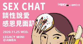 【Legacy mini @ amba】Sex Chat 談性說愛 感恩見面趴 主辦單位: 若谷股份有限公司 ,群欣置業股份有限公司 演出場地: Legacy mini @ amba 演出地址: 台北市武昌街二段77號5樓 演出日期: 2020-11-25(三) -