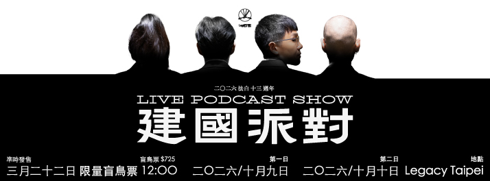 2026 法白 13 週年 LIVE PODCAST SHOW|建國派對 主辦單位: 若谷股份有限公司 演出場地: Legacy Taipei 傳音樂展演空間 演出地址: 台北市八德路一段一號華山1914創意文化園區 中五館 演出日期: 2026-10-09(五)